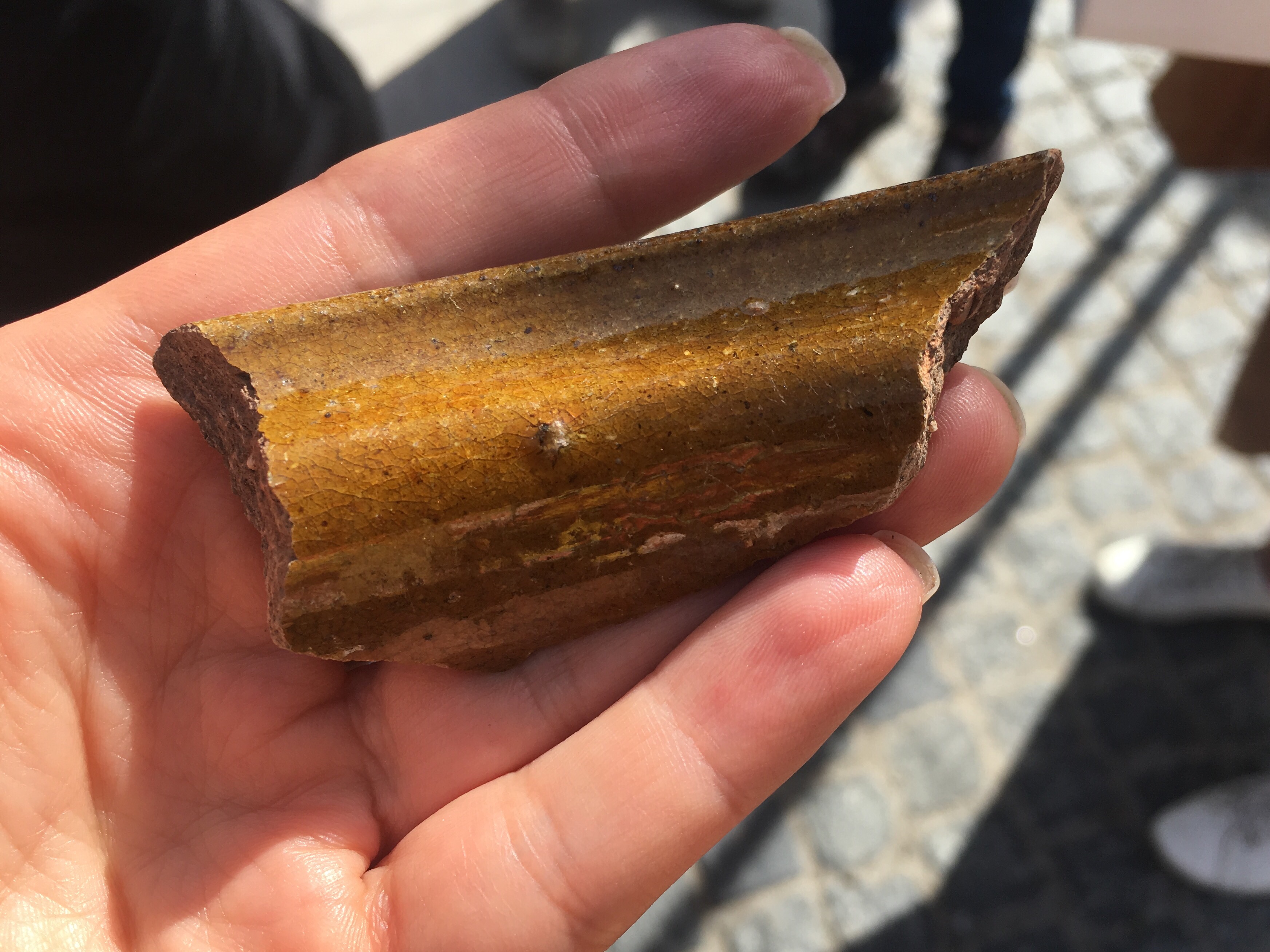 För två och ett halvt år sedan, i november 2013, var jag på en liknande visning. Då fick vi titta och känna på den här dekorativa biten från en 1500-talskakelugn, framgrävd i samma område (jag skrev om det här).
