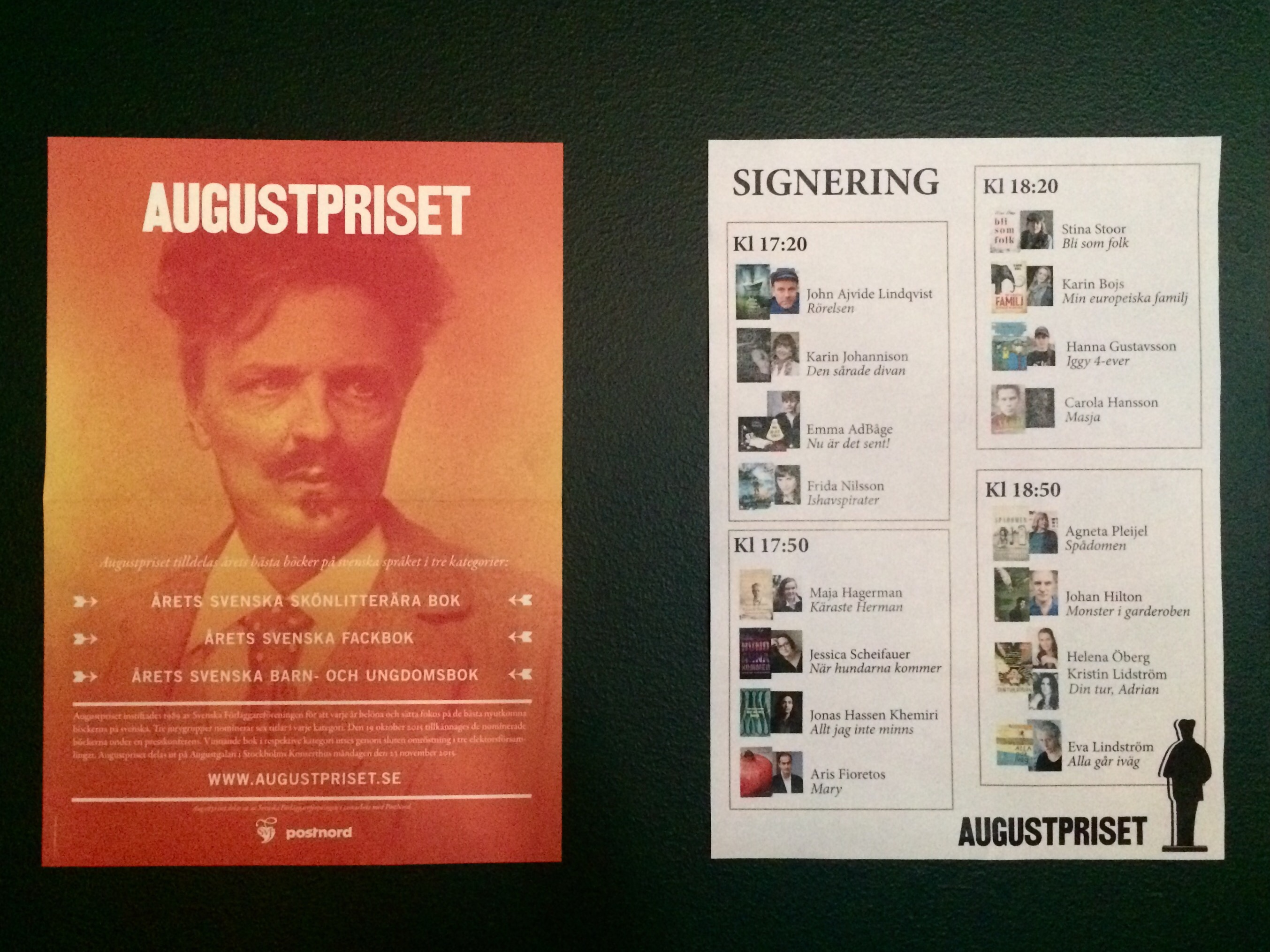 Det dök upp en specialinbjudan till Stockholms stadsbiblioteks personal till kvällens Augustprisevenemang i Kulturhuset och jag var inte sen att haka på. Några timmar efter att årets nominerade titlar avslöjats arrangerades alltså ”Augustpriset Live”, med sändning i Expressens TV-kanal och förmodligen på Augustprisets sajt och kanske någon annanstans.