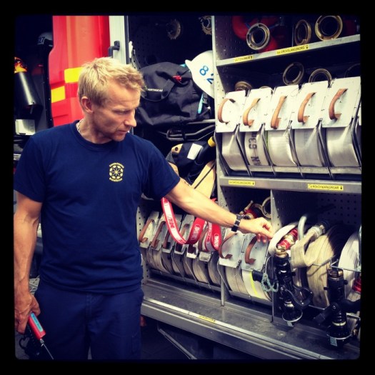 ”Hur öppnar ni dörrar?” frågade någon. ”Här är nyckelknippan!” sa brandmannen och höll upp det här tygfodralet med två kofotvarianter och en yxa. ”Men yxan har vi mest med för att det är kul”, påstod han.