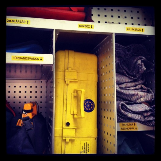 Bakom den här luckan fanns utrustning för att ta sig in och fram på svåråtkomliga ställen. Någon pekade på den gula apparaten till höger, som såg ut att vara något slags cirkelsåg, men nja, den var inte så bra, sa brandmannen, men den blå som satt bakom den gula, den gillade han.