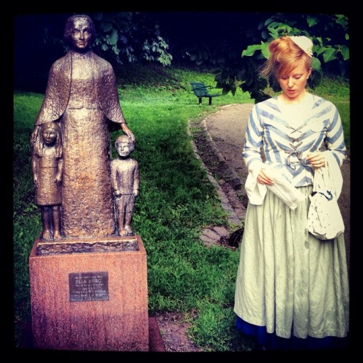 Mitt i regnet blev det både svårt att lyssna och fotografera, men här har vi kommit fram till Vitabersgparken, regnet har upphört, vi har fått höra de olika teorierna kring områdets namn (det kan ha att göra med den ljusa, vitaktiga bergarten eller att man bredde ut lintyg här för blekning) och har nu hittat Elsa Borgs staty. Hon arbetade med kristen mission och socialt arbete i Vita bergen, som var ett slags kåkstad under slutet av 1800-talet. Det är sådant som är intressant att tänka på när man ser de upprustade trähus som finns kvar i området och förmodligen är bland de mest eftertraktade, och mest idylliska, bostäderna i Stockholm.