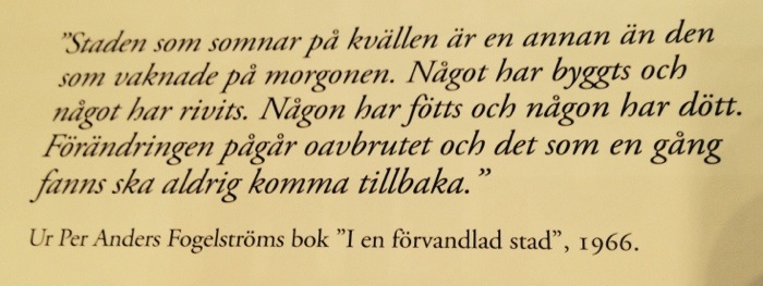 En fint formulerad iakttagelse från en stadsromantiker – den fantastiskt produktiva stockholmsförfattaren Per Anders Fogelström – till en annan – denna kungsholmsbo, som gillar den beskrivna stadsaktiviteten och motstridigt nog trivs så bra där tiden stått stilla.