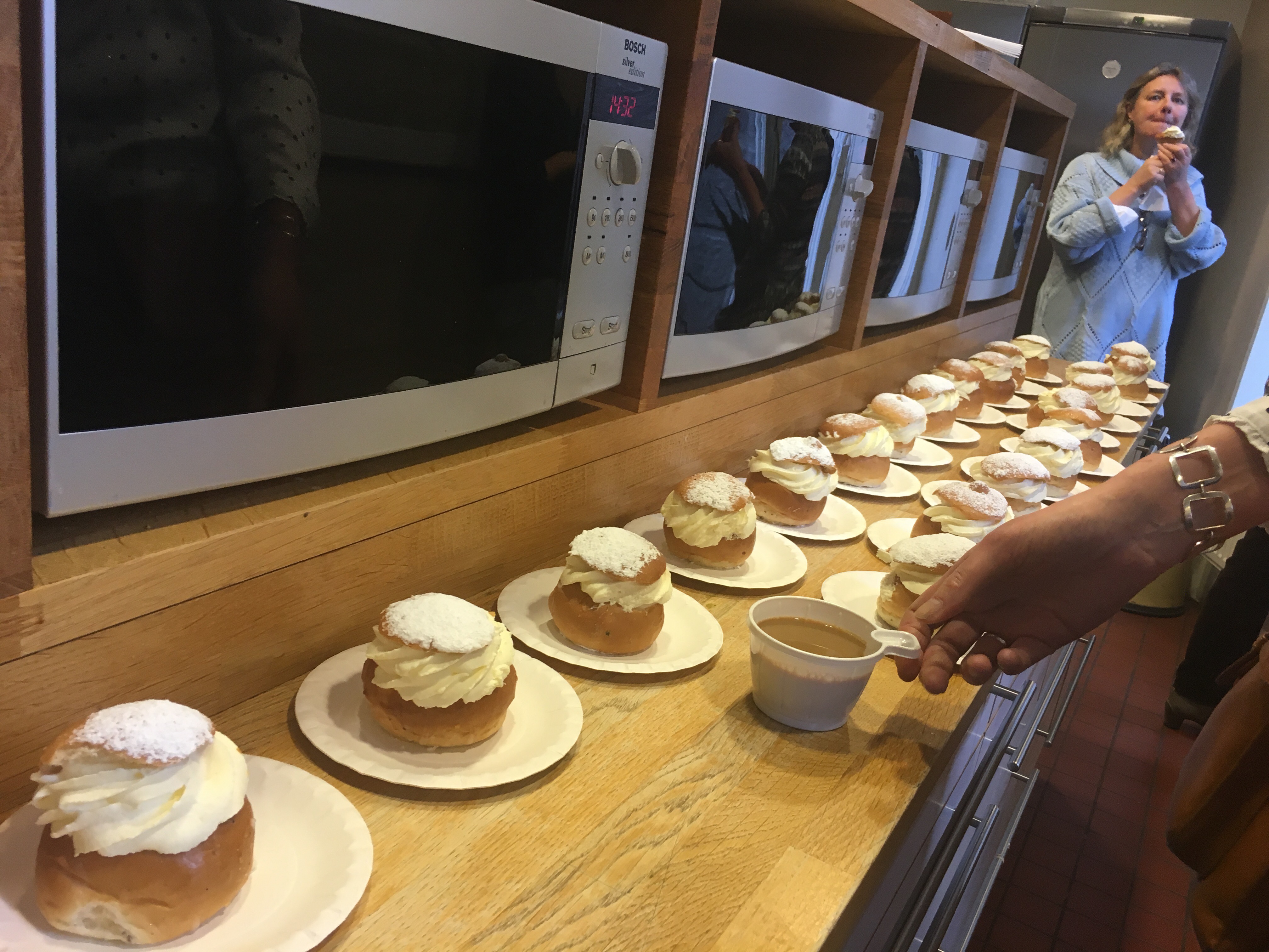 Jag tog med en bärbar dator till Källarstugan – trots att det utgjorde ett ohyggligt anakronistiskt inslag – för att vi skulle kunna se på förlagets boktrailer med en miniintervju med författaren, och när datorn nu ändå stod där, med högtalare ikopplade, letade jag upp en spellista med Bellman-visor på YouTube så att de stod på när kollegan Annika kom in med gruppen som hon hämtat från samlingsplatsen nere i biblioteket. Därmed var stämningen maximerad. Till och med chokladbitarna på bordet var genomtänkta – jag hade valt Mozartkulor, som visserligen skapades hundra år efter den tid vi läst om i boken, men det är ju i alla fall ett porträtt av 1700-talspersonen Mozart på omslagsfolien, med pudrad peruk och allt.