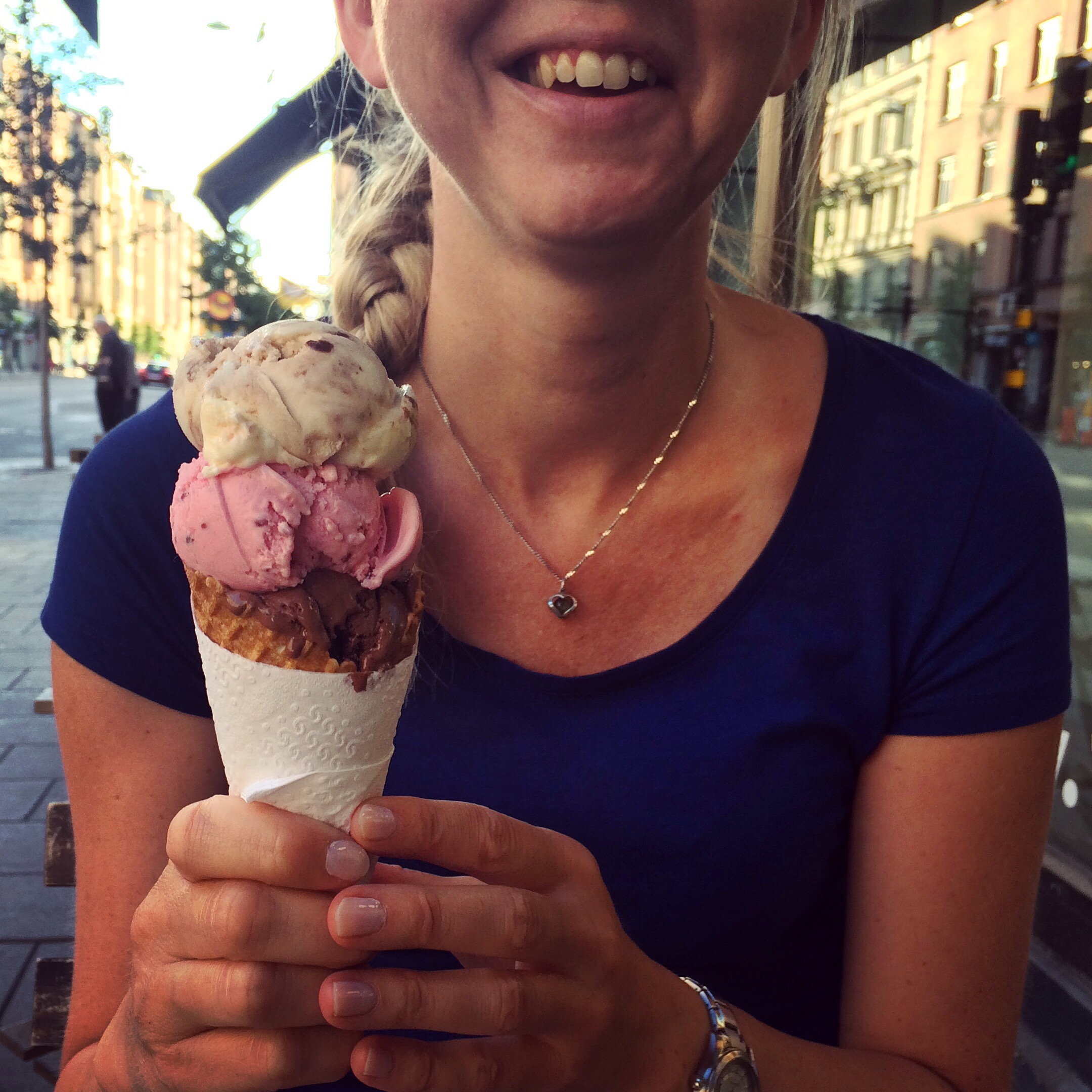 När vi tog en glasspaus valde jag kladdkakeglass, som jag har sett frestande reklam för. Som chokladglass – 4,5 glasspinnar av 5. Som kladdkakeglass – 3. Det var som en kräm inuti, men inget som liknade kladdkaka. Bara att döpa om den, så blir den jättegod.