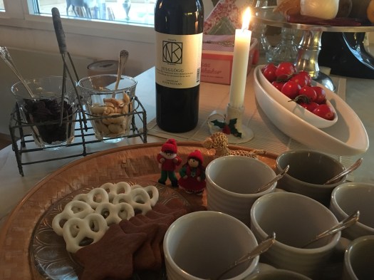 Välkomstglöggen står framme när brorsan, svägerskan och brorsbarnen kommer från Örebro för ett par dagars julfirande. Lite barnvänliga, juliga figurer på brickan, och både sjuåringen och fyraåringen tackade nej till äppeljuice, de ville ha glögg (alkoholfri, naturligtvis) ur den stiliga NK-flaskan och verkade tycka att den var god. Det gör jag med, mycket.