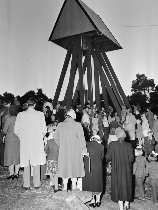 Jag behövde ett konkret exempel och valde ett foto från 13 september 1952 föreställande invigningen av Årsta kyrkas klockstapel, vars post i databasen inte hade så jättebra ämnesord. (Jag hoppas och tror att det är en av alla poster från Stadsmuseet som körts in i Stockholmskällans databas i en massöverföring och att ämnesorden sattes av någon museimedarbetare för många år sedan.) Hur beskriver man bilden bäst i ämnesordsform? I vilka sammanhang blir en användare nöjd med att få just den här bilden som träff vid en sökning?