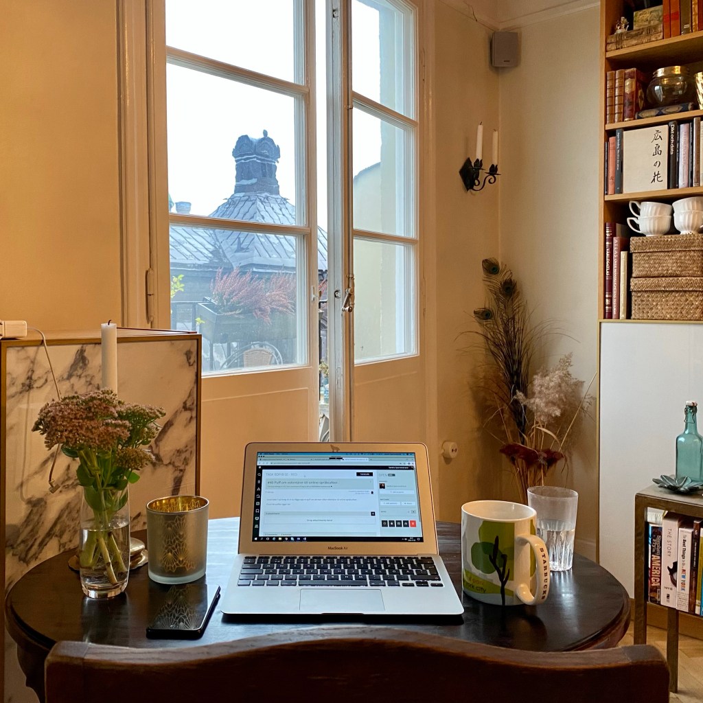 Det oktoberregnar utanför balkongdörren. Tänker jag missa det? Nej. För att kunna jobba och samtidigt optimera regnupplevelsen flyttar jag helt enkelt kontoret till platsen med bäst utsikt. (Uppskattad tidsåtgång: Sju sekunder, bärande av bord samt stol två meter.)