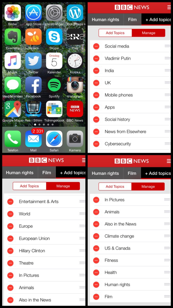 Och där kvalificerade sig BBC News-appen för en plats på mobilens hemskärm. Sedan möjligheten tillkom att välja favoritämnen och i vilken ordning de visas är jag mycket mer benägen att gå in och läsa. Så här ser mina val ut för närvarande.