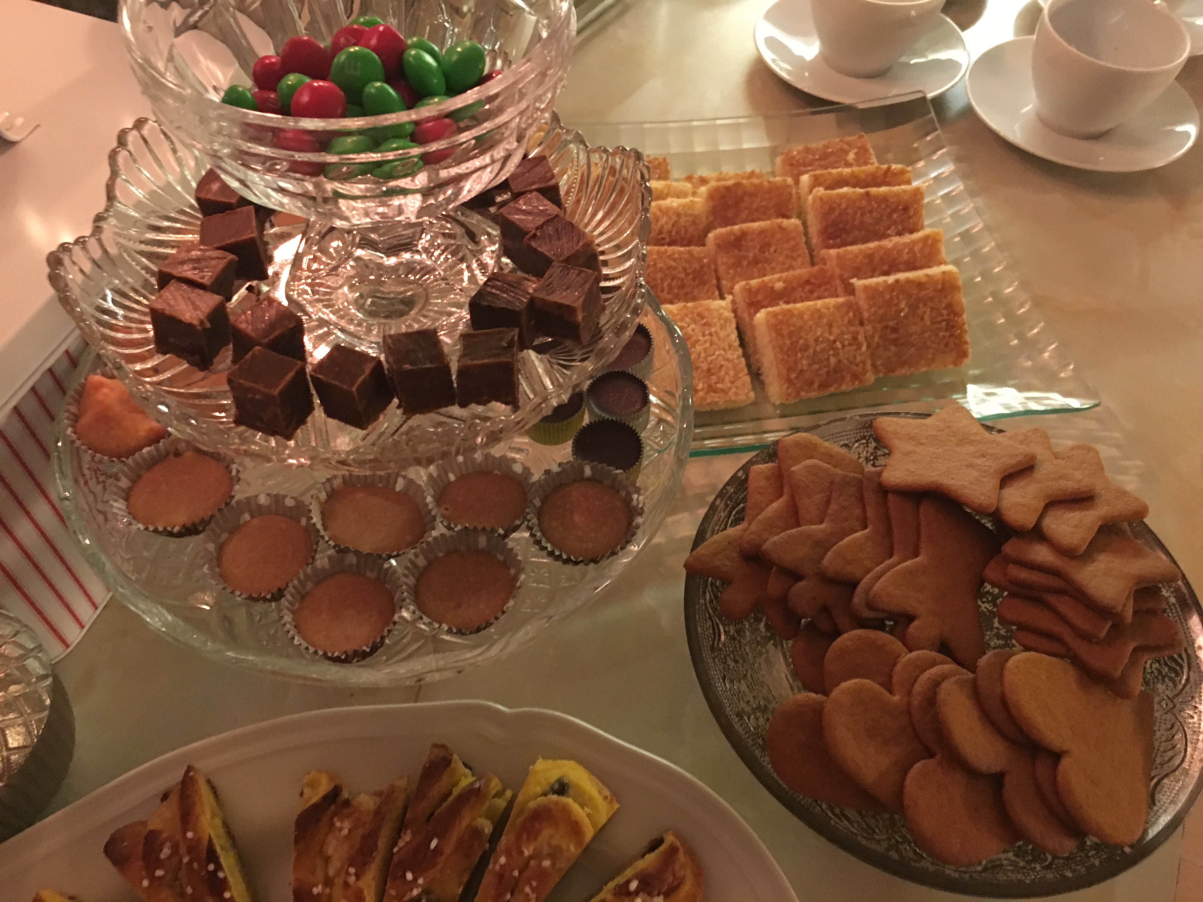 Och så julgodis, förstås. De här pyntade polkagriskäpparna blev inte ens framtagna i julas, och det hemmagjorda var också kompletterat med jul-M&M’s från New York, med jordnötssmör respektive vit choklad och mint, och så plockade jag fram knapriga majssnacks med kanel som brorsan köpt i Litauen. I kannan julte från mormor. Jag försökte maxa på alla fronter …