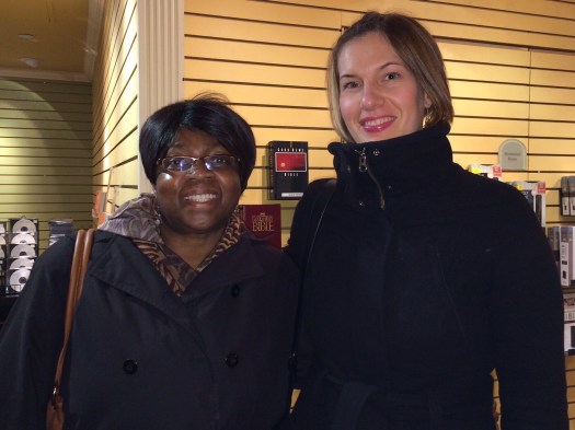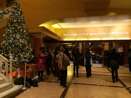 Vi hade hamnat bredvid den här jamaicanska kvinnan, som tog sig an oss på alla sätt och vis, och när gudstjänsten började gå mot sitt slut tog hon snabbt med oss till foajén, så att vi skulle slippa köa för att få våra små presenter.