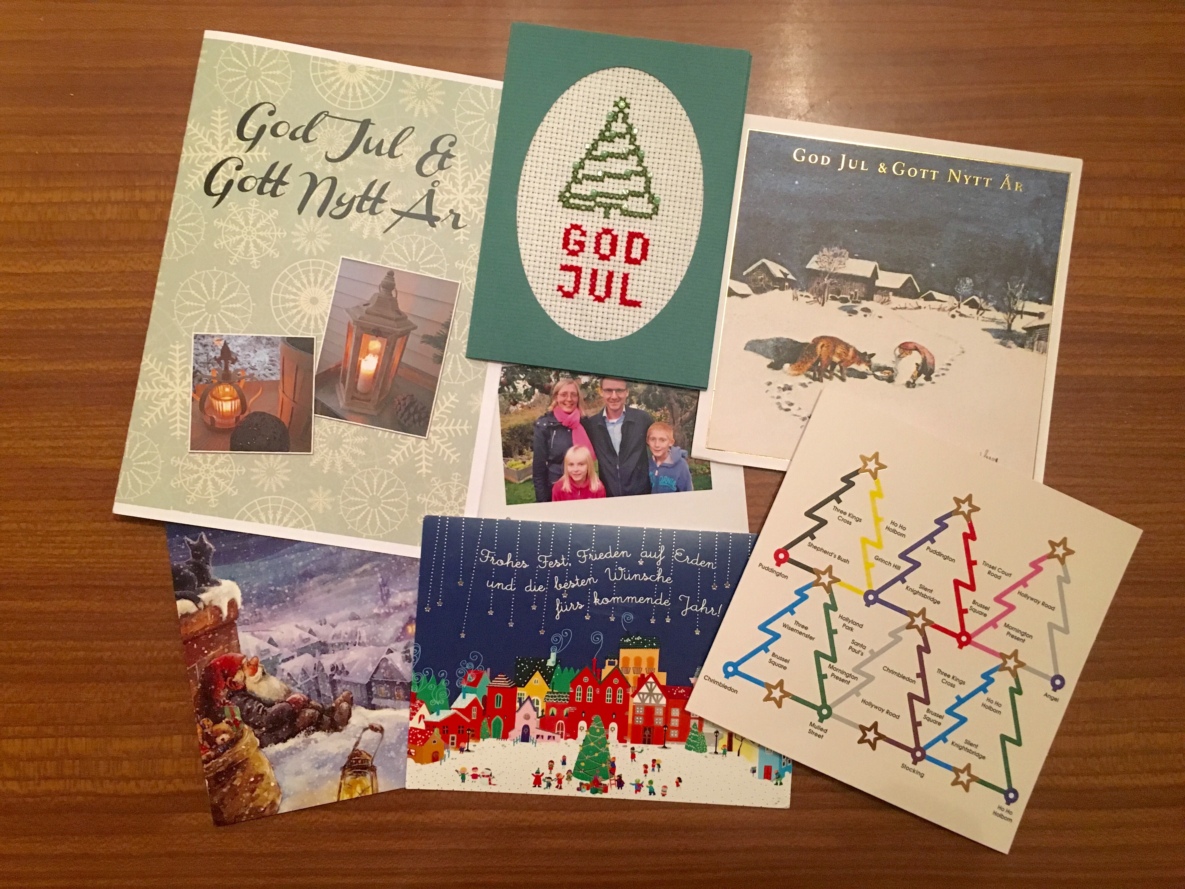 Och så den lilla julkortskörden. Favoriterna är nog det längst ner i mitten, som Andrea i Milano skrev på ett tåg någonstans i Tyskland på väg hem till Italien, och den broderade julgranen, ett otroligt arbetat julkort som bloggaren Surströmmingen (alltså kollegan Helenas mamma) knåpat ihop. De andra korten har alla sina egna förtjänster och jag blev väldigt glad över allihop.