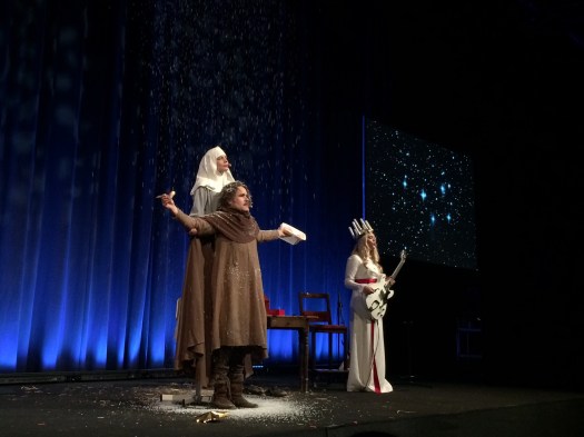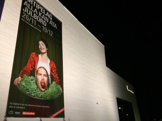 I juli bokade Jenny F och jag biljetter till Lotta Lundgrens och Erik Haags show “Alla kan äta julbord”, inklusive själva julbordet, på Artipelag och runt halv fem lördagen 14 december – samma dag som jag var med och tillredde julbord för hemlösa – klev vi på en av flera gula, chartrade bussar på Vasagatan. När vi var framme där ute i obygden myllrade massor av folk in i det spatiösa museet, först till glöggserveringen och sedan fick man ta plats i den stora salen med många och långa långbord. Av någon anledning tog det lång tid för personalen att komma fram till var någonstans vi och några till skulle sitta, bordsnumren saknades i listan just vid våra namn och en aning bekymrad hann man bli, skulle de kanske behöva sätta in ett extrabord i någon vrå? Men till slut leddes vi till våra platser – nästan längst fram vid estraden. Framförhållningens förtjänst, får man anta.