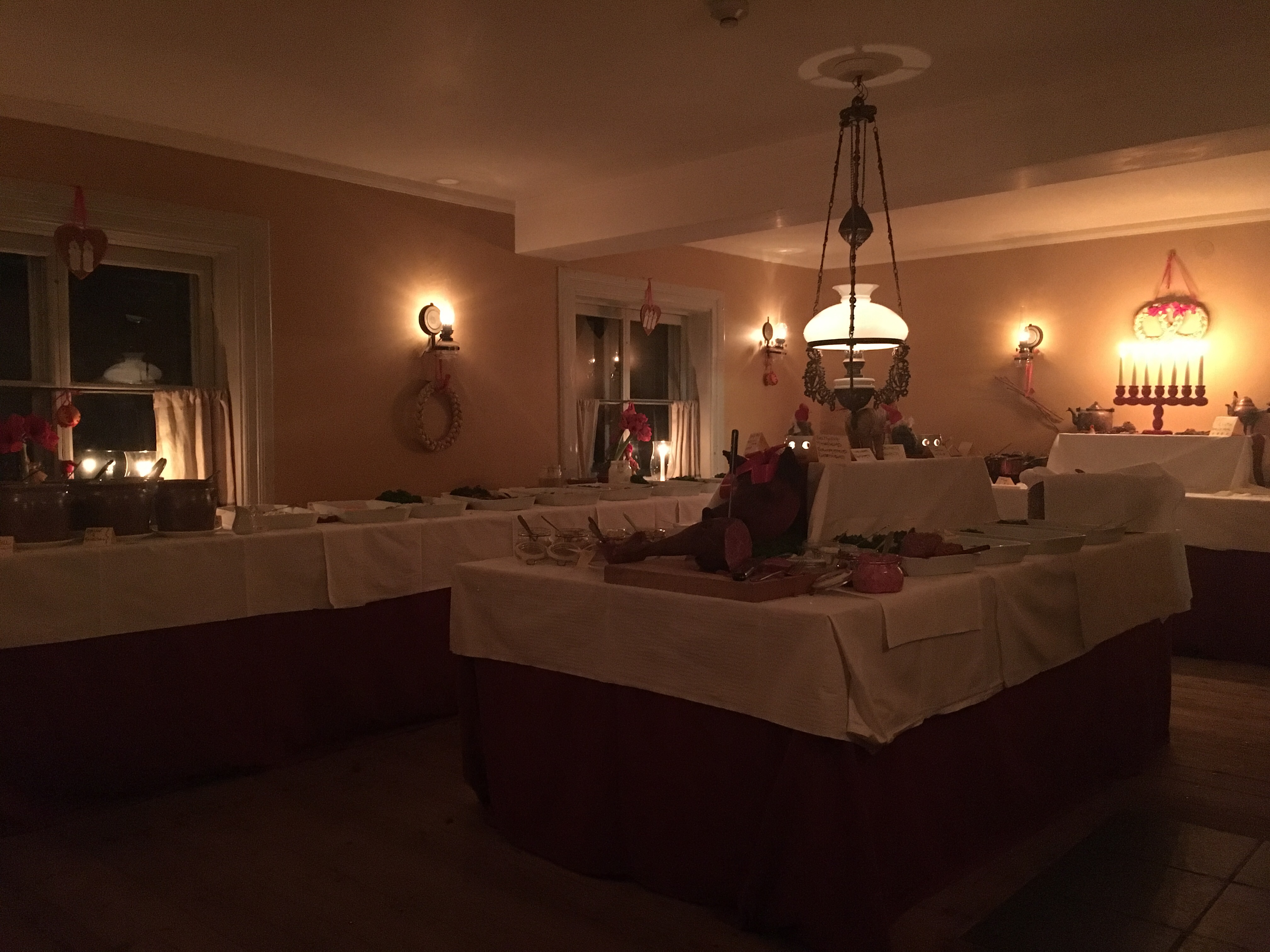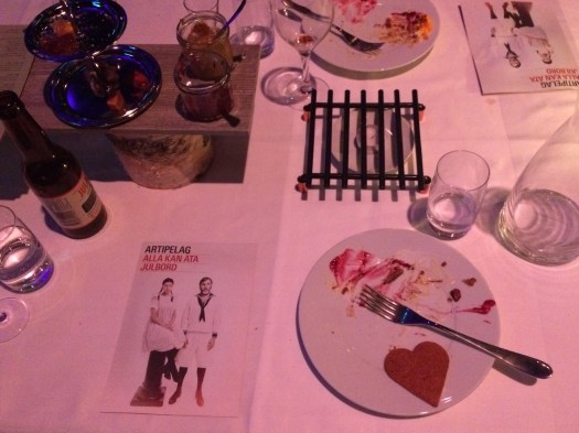 Det mesta av maten serverades vid bordet. De små portionerna dukades fram för grupper om sex personer, så vi två och fyra till skickade runt sillburkar, senapsburkar, grisfötter (premiär för mig), en potatiskarott som jag brände mig något vansinnigt på och en massa annat, medan andra delikatesser som ost och små köttbitar togs från en gemensam bräda lagd över två små trädstubbar på bordet. Det var trevliga och ytterst sociala människor vi hamnat vid, så det var enkelt att utgöra ett portionssällskap. Den varma maten serverades som buffé, men till skillnad från den bordsserverade var den dåligt beräknad, mycket var slut när Jenny och jag kom fram i kön, så när det var dags för den andra buffén, desserterna, störtade vi fram och kunde ta för oss så mycket vi ville av saffranspannkaka, äppelkaka, mjuk pepparkaka, klenäter och det mesta man kunde önska sig i dessertväg, medan konfekten kom till bordet på ett litet våningsfat. Maten skulle motsvara ett julbord 1907, men jag tror att de tänjt lite på gränserna när de serverade flortunna små flak av mörk choklad med ett rött pulver på, sannolikt frystorkade hallon eller jordgubbar, och små kuber av ljus fudge. Sammantaget var det ett riktigt bra julbord med vällagad mat, bara bestående av klassiska rätter men ändå väldigt omfattande. De många men små matbitarna visade tydligt att poängen var att uppleva smaker, inte att glufsa i sig av det man gillar mest.