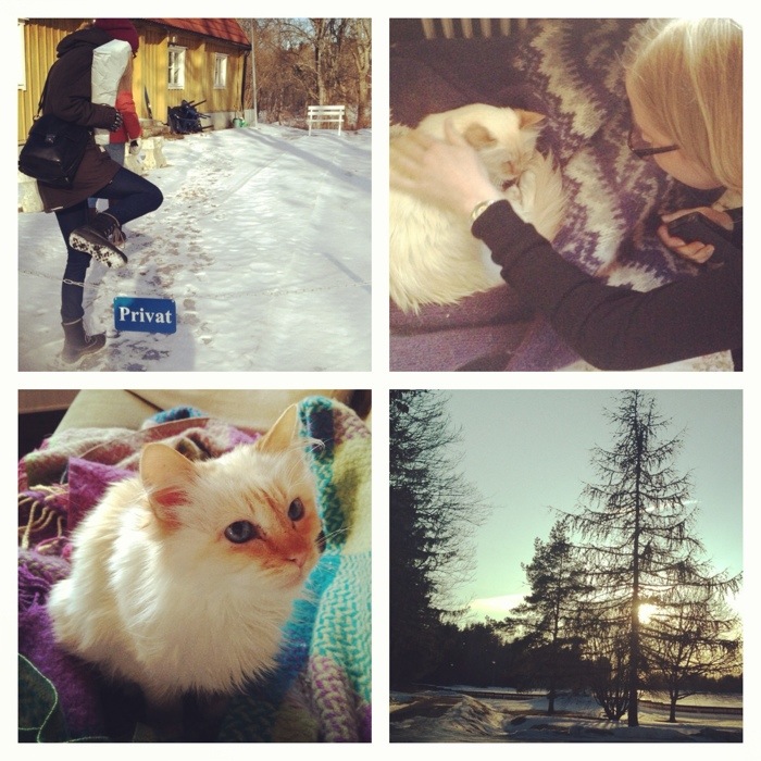För kattcafébesök är ju ett av mina främsta utomlandsnöjen. I tretton länder har jag klappat katter, sådana som hålls beskyddade i en starkt avskärmad miljö under personalövervakning, medan man på nåder får vistas i samma rum, och sådana som rör sig fritt överallt och kråmar sig kring kassaapparaten när man köper sitt fika. På kattcaféet i mitt fjortonde land i listan, närmare bestämt i Vasastan, var det den avskärmade modellen, men ändå ganska avslappnat och väldigt vänligt. När H och jag var där förra veckan var det första dagen på kattcaféet för det nya gänget på nio katter och därmed släpptes bara fyra personer in i taget. Gästglesheten bidrog nog till trivselkänslan, det var lugnt och fridfullt – när katterna inte for som skottspolar under lek och jakt genom lokalen – och behagligt att sitta och fika eller gå runt och socialisera med de katter som var sällskapligt sinnade just för stunden.