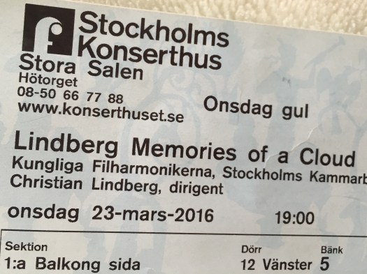 Kungliga Filharmonikerna och Stockholms Kammarbrass, eller Stockholm Chamber Brass, framförde ”Memories from a Cloud” (inte ”of a Cloud” som det står på biljetten) och efter pausen fick vi höra Allan Petterssons Symfoni nr 4. Den sistnämnda förlyssnade jag på på Spotify på låg volym under tiden jag jobbade, så åtminstone mitt undermedvetna var förberett. Ingetdera var lättlyssnat, men upplevelsen var ändå riktigt fin.