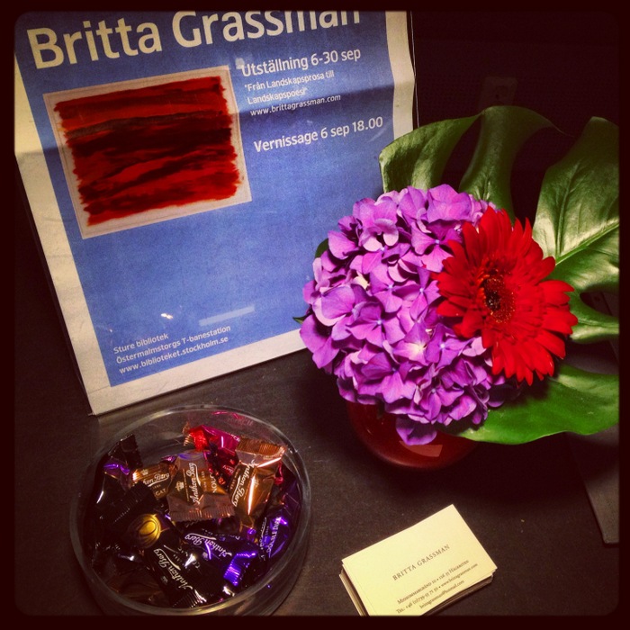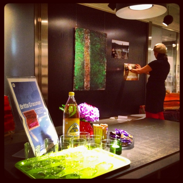 I eftermiddag hängde Britta Grassman sin utställning på Sturebibblan. Bara några få verk, men fina, i sig själva och i miljön. De ska sitta uppe till 30 september. Jag och Nike gjorde vårt bästa för att hjälpa till, höjde och sänkte krokar, riktade ljus.