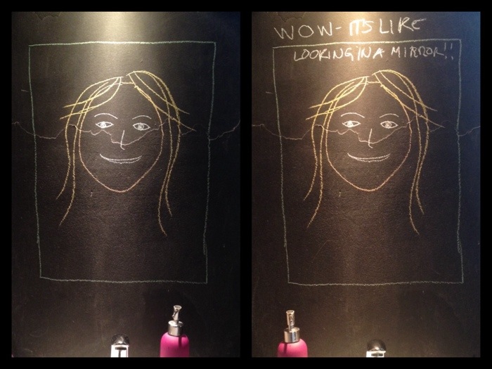 Därefter återstod bara en matbit innan vi skulle ta tåget hem. Självklart valde vi att äta på vårt stamlokus Kaffí. Vi beställde av samma, nu flinande, kille bakom disken, satte oss vid samma bord, satte i våra mobilladdare och åt varsin macka. När jag besökte damrummet noterade jag att mitt konstverk på den ritbara väggen från dagen innan hade kompletterats med en kommentar, vilket jag tog en bild på och visade Lena. ”Jaså, var det du som ritat?”, sa hon. ”Det var jag som skrev!”
