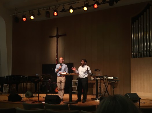 Temat för dagen var ”måndagsångest”, vilket innebar livsleda i största allmänhet, tomhet, meningslöshet. Före predikan sjöngs trallvänliga ”Ingen vill veta var du köpt din tröja” och Niklas Piensoho talade om hur tomhetskänslan kan drabba både troende och icke-troende, vad det kan bero på och vad man kan göra åt det. Efter predikan ställde sig en lång rad förebedjare längst fram, nedanför estraden, och det bjöds in till förbön. Kommer folk att våga gå fram så där öppet? undrade jag, van vid Korskyrkans lite mer diskreta modell med förebedjare längs lokalens sidor. Men jo då, den första kom fram redan innan Niklas Piensoho slutat prata, sedan kom en stadig ström. Nu är jag alltid blödig när det gäller förbön, av någon anledning, men den här gången fick jag verkligen skärpa mig för att inte vara totalt rödmosig vid gudstjänstens slut. Andras bön kan beröra väldigt starkt – och nu var de så många, så olika (i ålder, stil, nationalitet) och så glada. Man kan ju tappa fattningen för mindre.