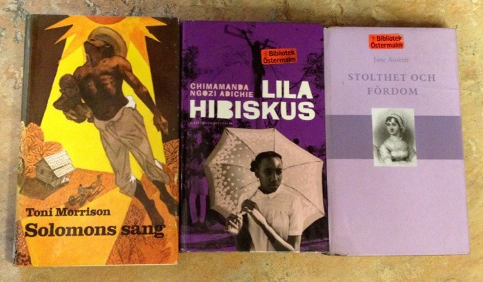 När man sitter i vuxeninformationen på Östermalms bibliotek ingår det i passet att sätta upp skönlitteratur från bokvagnar som står parkerade i närheten. Bibliotekets bestånd är ganska brett och det finns en hel del äldre litteratur, så på vagnarna står alltid en viss andel titlar som inte är bekanta för mig över huvud taget, men de flesta väcker i alla fall något slags associationer, ibland flyktiga, ibland starka. Tre exempel från en av dagens vagnar: Solomons sång – ”den här gjorde jag och några till ett arbete kring på Litteraturvetenskap B 1996 och jag kan inte ens tala om vad den handlar om längre”. Lila hibiskus – ”den här fick jag låna och anmodades läsa av Eva i somras och visserligen sa jag att det kunde komma att dröja, men det borde verkligen inte ha dröjt så här länge”. Stolthet och fördom – ”tänk att jag har så många själsfränder i min närhet som också insett den här bokens storhet, så pass att vi samlades ett stort gäng hos Lotta för ett år sedan och maratontittade på den klassiska TV-serien från 1995, och snart ses vi några stycken på samma plats för att se Mansfield Park”.