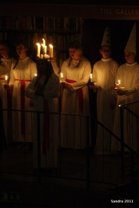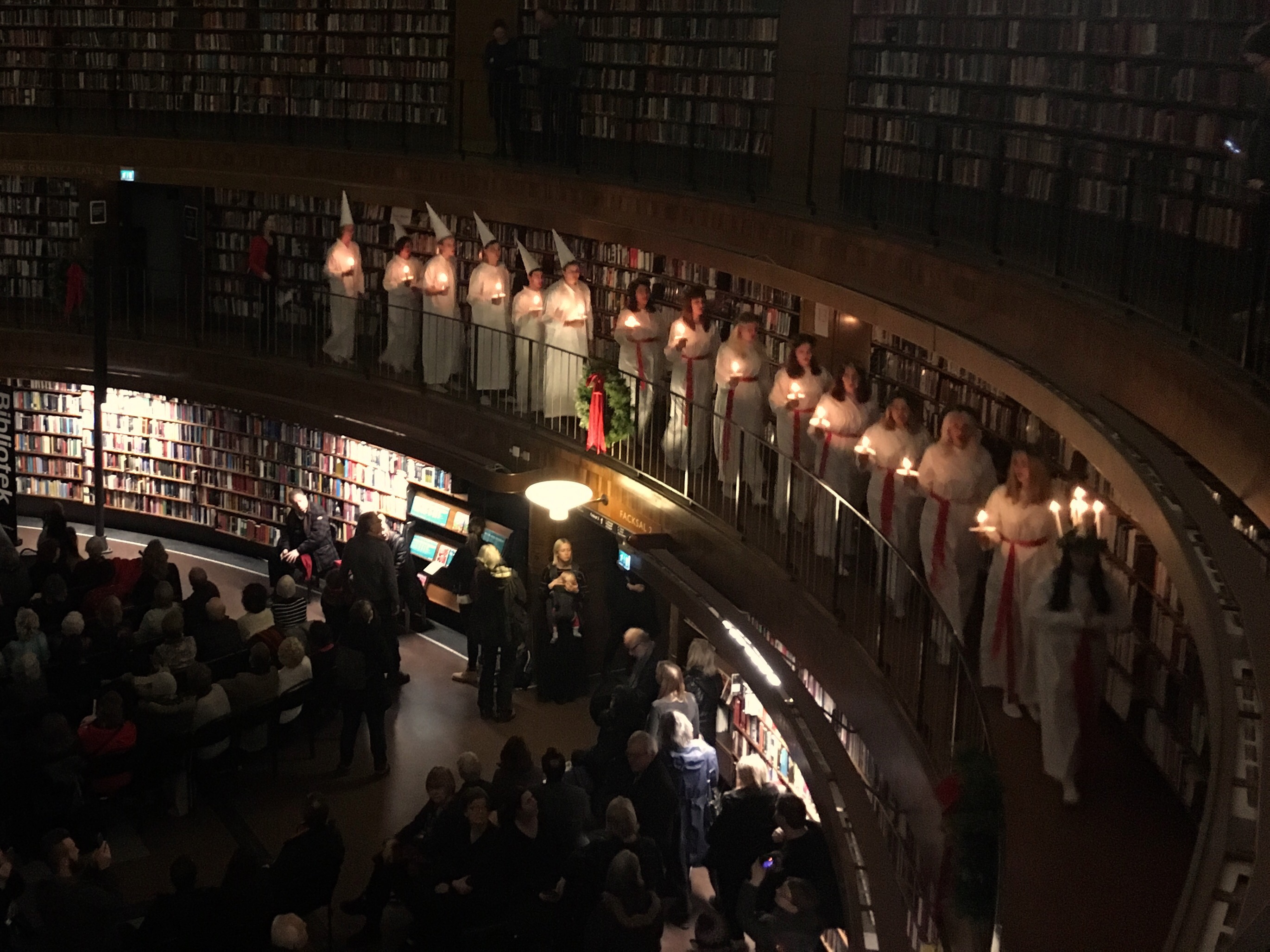 På väg till jobbet såg jag NK:s luciatåg stå där inne och sjunga, samtidigt som några mogna herrar och damer med strutar och lingonkransar och vita särkar under täckjackorna skyndade förbi utanför, på enhetsmötet på Sturebibblan åt vi lussekatter och sedan var det luciafritt fram till klockan tre, då jag lämnat mitt skrivbord på Regionbiblioteket för att gå över och se Stadsbibliotekets luciafirande. Det är årets höjdpunkt i rotundan. Både på golvet och på gallerierna var det fullt av folk, ljudnivån sänktes drastiskt när lamporna släcktes, och sedan böljade ljudet upp och ner eftersom luciatåget dröjde. Men efter att vi stått någon kvart i mörker dök de upp. Det är möjligt att Kungsholms kyrkas luciakonsert smällde högre sångmässigt, men rotundan är som gjord för luciatåg. Det blir oerhört effektfullt i den miljön. Jag har inget minne av att ha missat Stadsbibliotekets luciatåg någon gång – har det infallit på en ledig dag har jag kommit ändå – så det här kan ha varit elfte gången för min del. Med största sannolikhet firas det på samma sätt 13 december klockan 15.00 nästa år. Bara att skriva upp i almanackan!