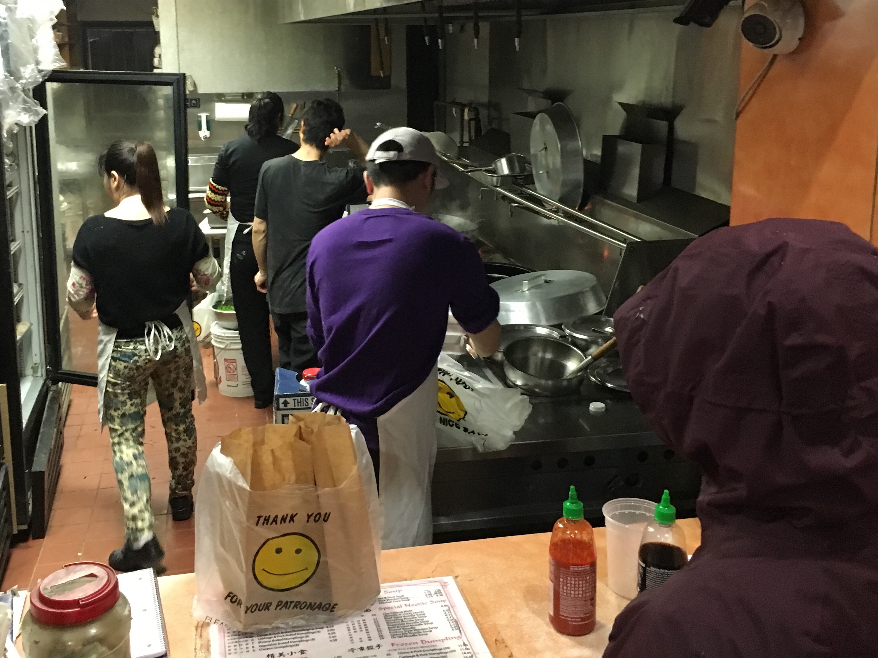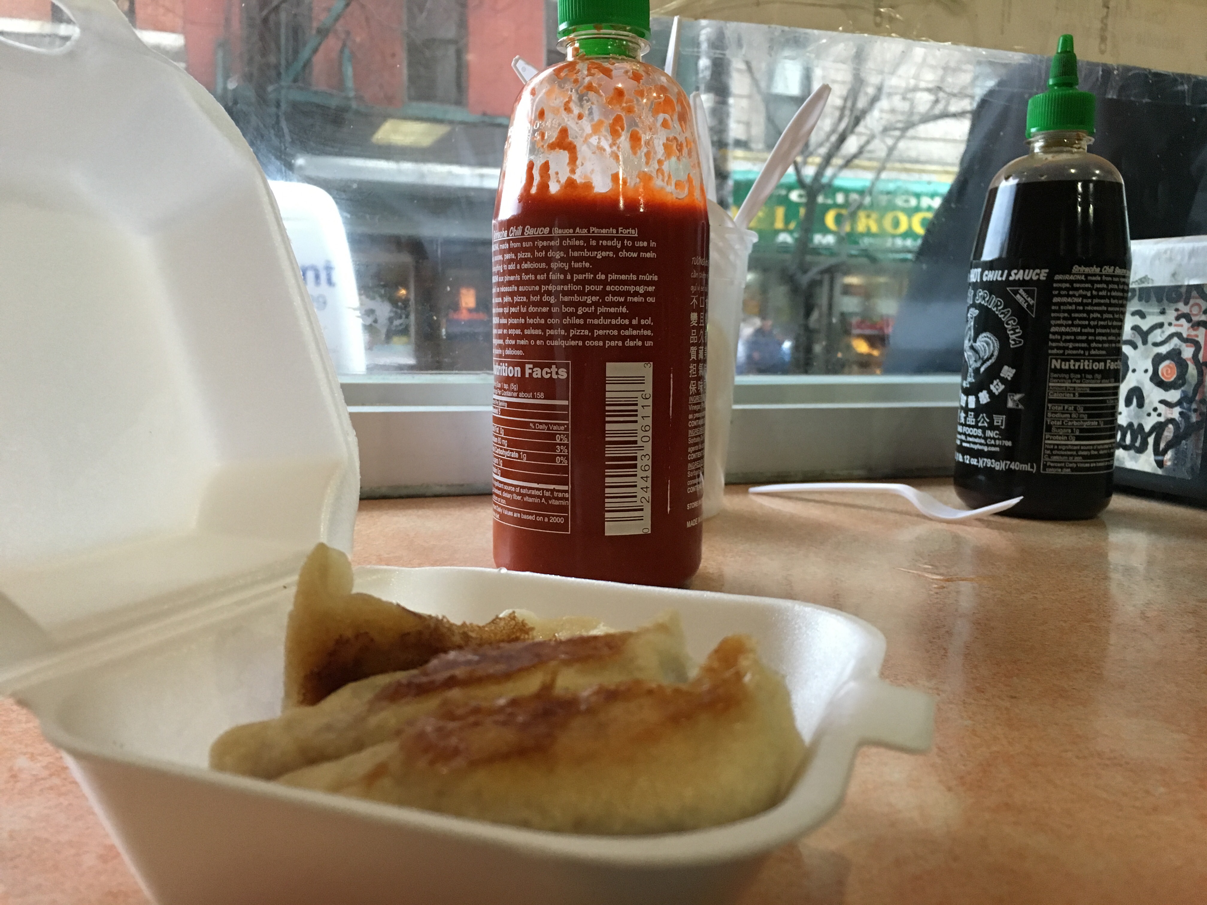 Nästa anhalt var Prosperity Dumpling på Eldridge Street, ett hål i väggen med några sittplatser och ytterligare ett hål in till köket. Jag var först i kön, men de som stod där inne och lagade mat reagerade inte på en lång stund, trots att de omöjligt kan ha missat att en stor grupp just ramlat in. Till slut fick jag ögonkontakt, bad om ”chives and pork dumplings”, de godaste enligt guiden, och dessutom oförskämt billiga. Nu var jag ganska säker på att min beställning blivit uppfattad, men jag fick inget svar och kunde bara iaktta hur killen där inne började förbereda ett antal frigolitlådor, varav jag hoppades att en skulle vara till mig. Till slut fick jag mina dumplings och kunde sätta mig i fönstret och äta, och efter en stund hörde jag guiden säga till någon i gruppen att man får stirra på dem tills man får respons. Av flera skäl var alltså de här mycket goda och mycket prisvärda dumplingsarna mycket lätta att gå miste om. Jag hade inte valt att gå in om jag inte kände till stället och hade jag ändå gått in kanske jag hade vänt i dörren för att jag känt mig ovälkommen. Men nu vill jag gärna återkomma.