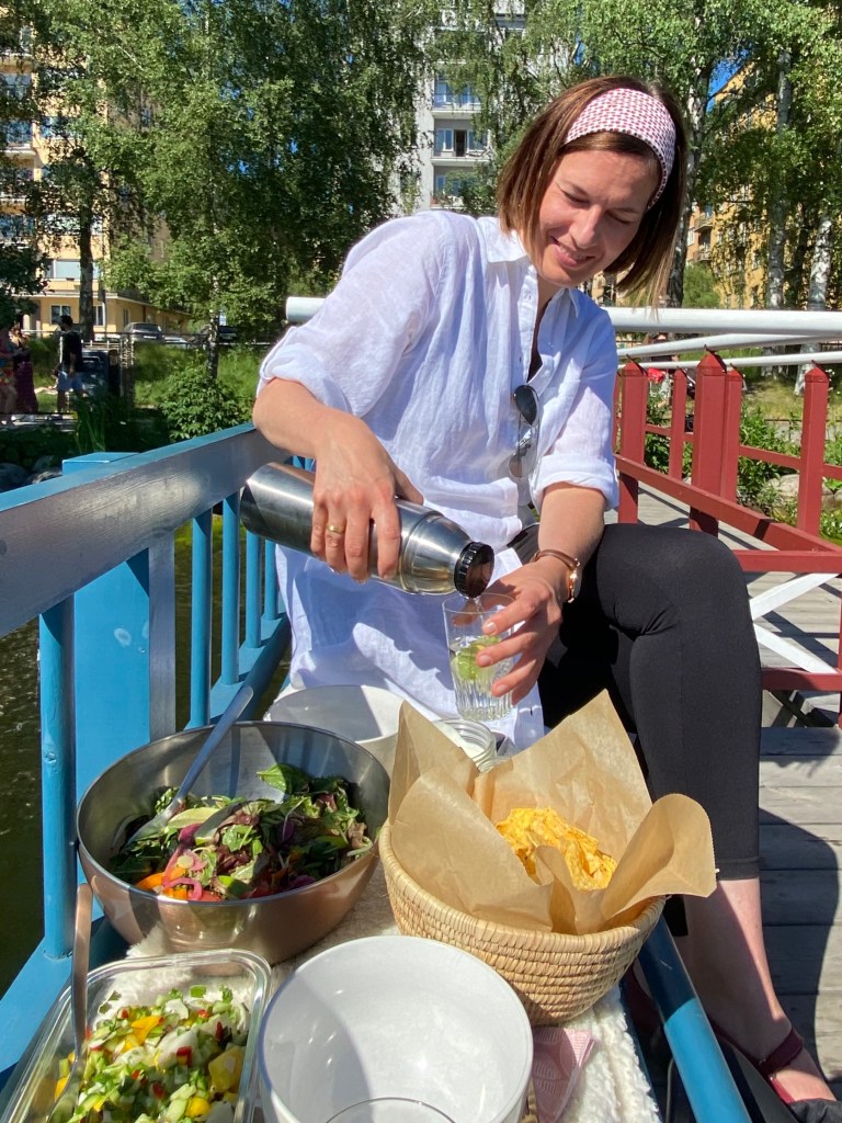 Här har fikat ställts fram på bryggan nere vid Norr Mälarstrand och en flaska handdesinfektion syns till vänster, för att verkligen markera vilket år bilden är ifrån. Födelsedagsfirande på den här platsen är ju faktiskt något återkommande, inte en särskild coronaanpassning.