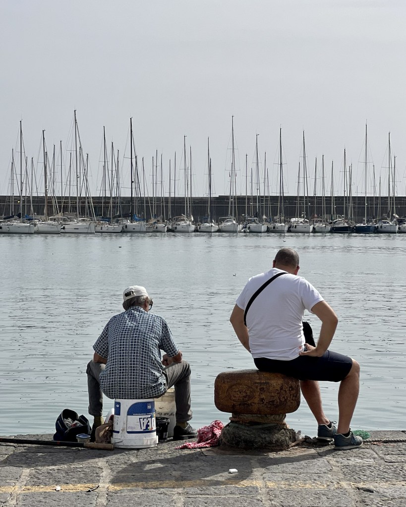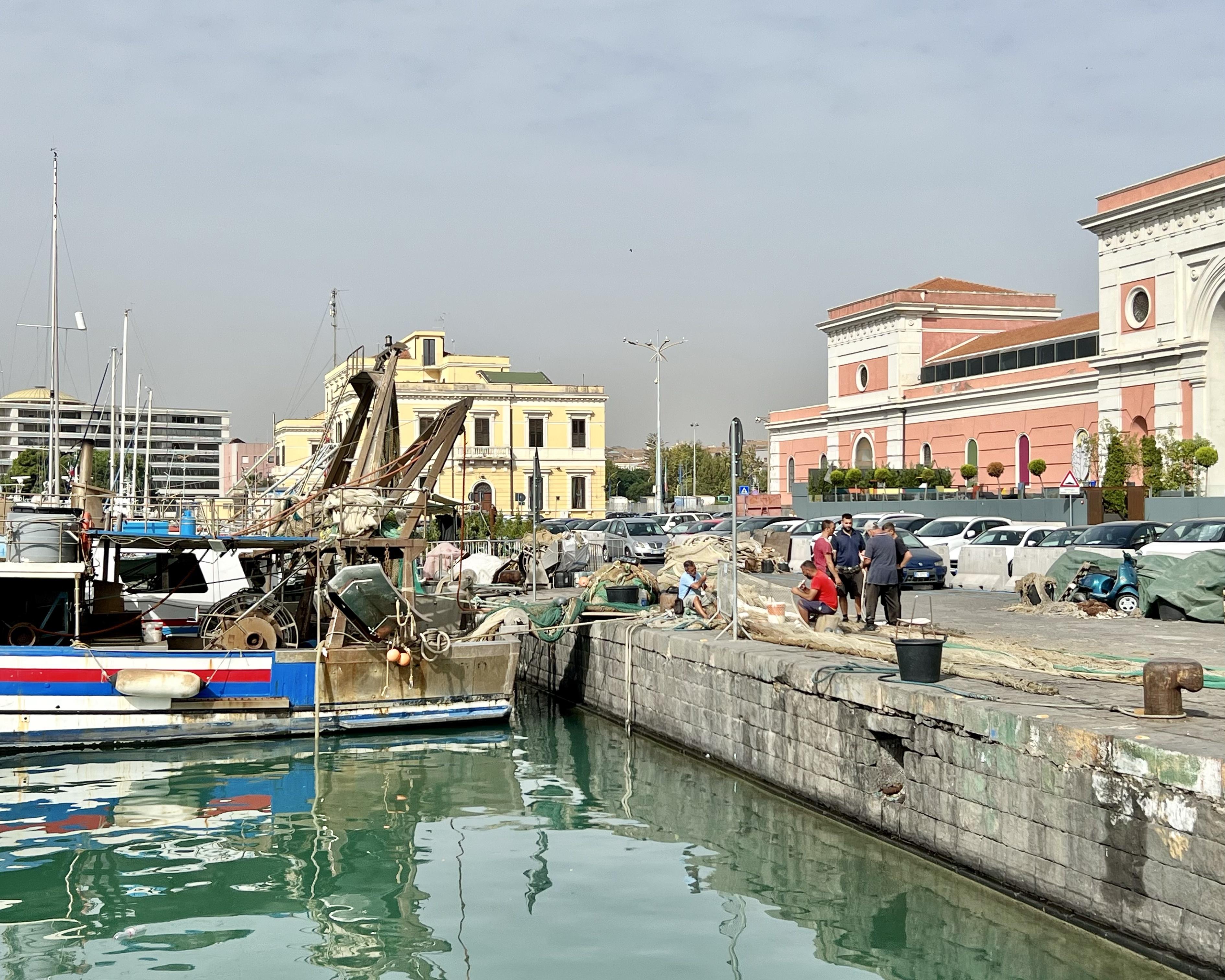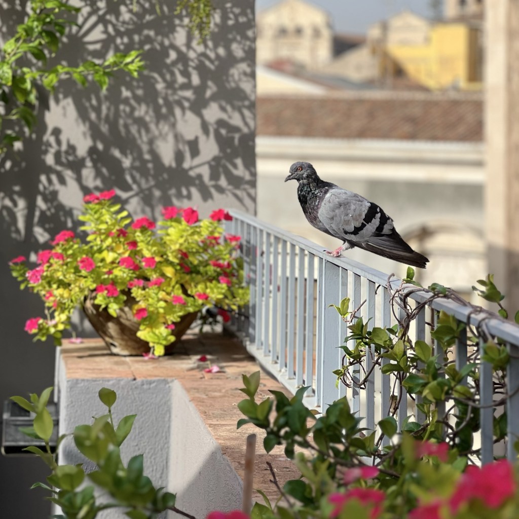 En halvdag i Catania, med sightseeing och praktiska bestyr. Alldeles för lite för att ge stadens kvaliteter en rättvis chans, men bara att äta frukost på takterrassen (bland alltför modiga duvor, som den ovan), kolla en marknad och uppleva det småskaliga fisket i hamnen ger en fin siciliansk fläkt. I hamnen besökte vi Avis-kontoret och skulle hämta vår hyrbil, men med tanke på de små utsikterna att hitta en parkeringsplats på smågatorna nära hotellet lät vi den stå kvar tills vidare.