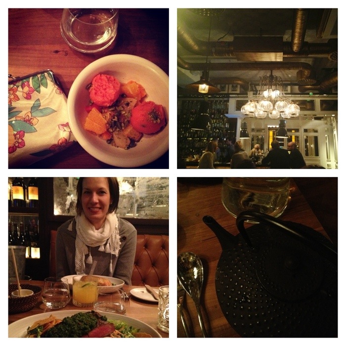 Den enda gemensamma lediga kväll vi hittade i våra kalendrar var just i kväll. Vi hade konstaterat att det var lätt att få bord, många lediga tider, och när vi kom fram var det också ganska glest mellan sällskapen. De få som satt där försvann dessutom pö om pö tills det bara var jag och Sofia kvar, trots att klockan inte var så mycket och det var långt kvar till stängning, men det gjorde inte oss något. Vi satt i ett mysigt litet rum och åt kanongod mat, nämligen skogssvampsoppa med crèmebakat ägg, hasselnötter och jordärtskockschips och därefter rödvinsbrässerad högrev med oxkorv, schalottenlöksmör, glaserade vintergrönsaker och mandelpotatispuré. Före och mellan rätterna tuggade vi i oss oväntade mängder gott bröd med smör och färskost som serverades i små frestande skålar.