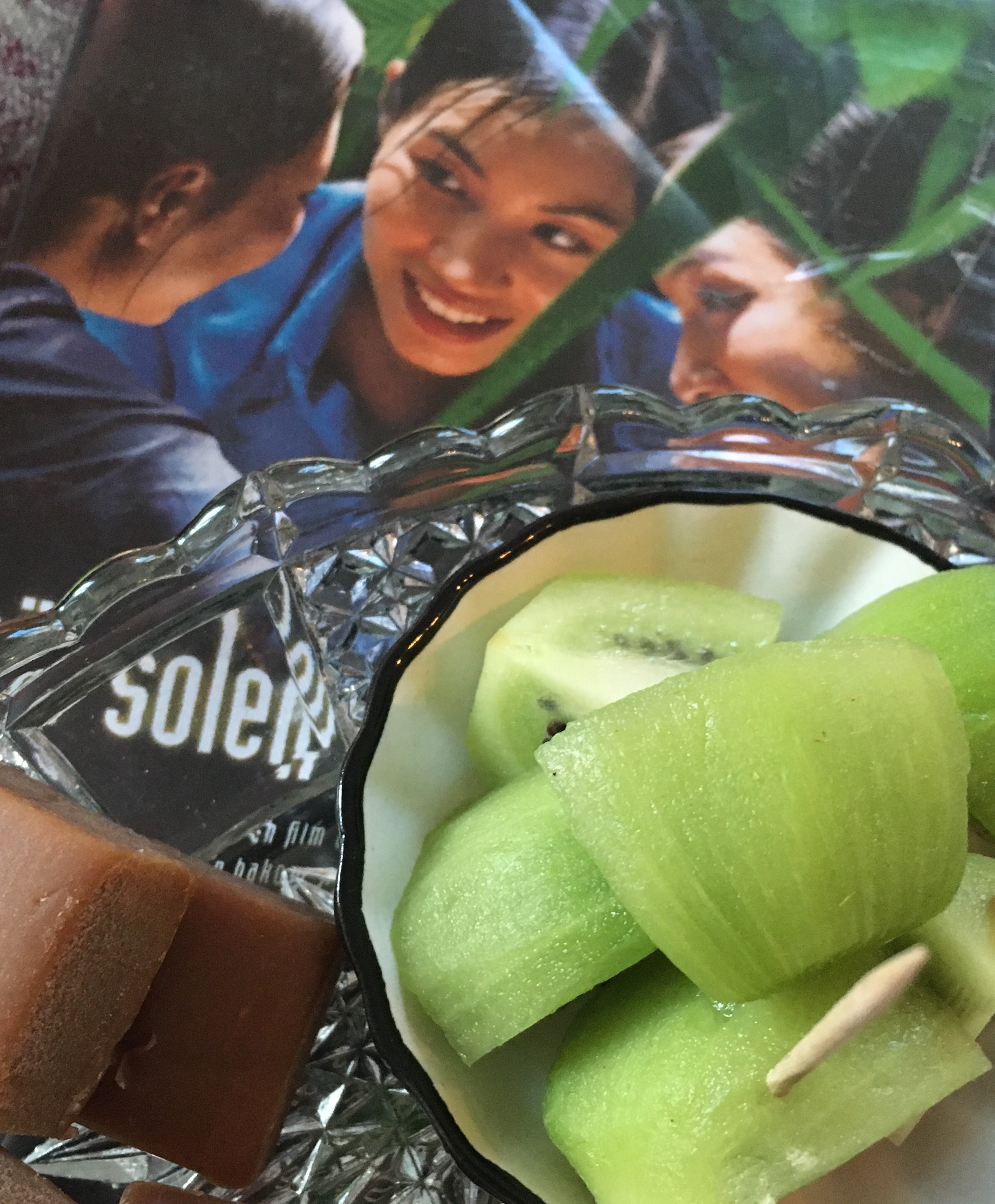 På bilden syns omslaget till ”När solen står som högst”, kiwibitar och moccafudge från Holland.