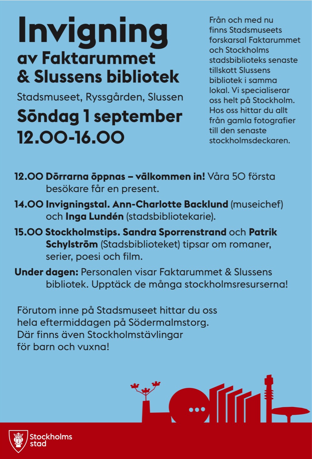 – 15.00 kommer undertecknad och en kollega att presentera stockholmsboktips i lokalen som nu kallas Faktarummet och snart Faktarummet & Slussens bibliotek.