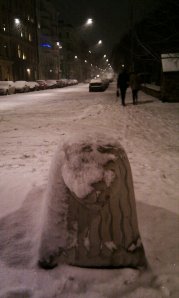 Tätt tätt tätt, vitt vitt vitt i luften på väg hem från jobbet. Efter en dag på ett underjordiskt bibliotek har man ingen aning om vad det är för väder. Vissa ledtrådar får man av besökarnas skick när de kommer in på biblioteket, och när man närmar sig trappan upp mot Birger Jarlsgatan vid arbetsdagens slut ser man om golvet är blött eller torrt och vad för slags ljus som kommer där uppifrån. Sedan sticker man upp huvudet i nivå med gatan och får äntligen veta om man ska gå hemåt längs Kungsgatan i rosa skymning eller duggregn – eller tjockt snöfall. Sedan söker man upp senaste podradioversionen av Biblioteket i P1, justerar hörlurarna, stoppar mobilen i kappfickan, böjer ner huvudet så att det bildas snödrivor på hjässan och vet att man är hemma inom någon halvtimme.
