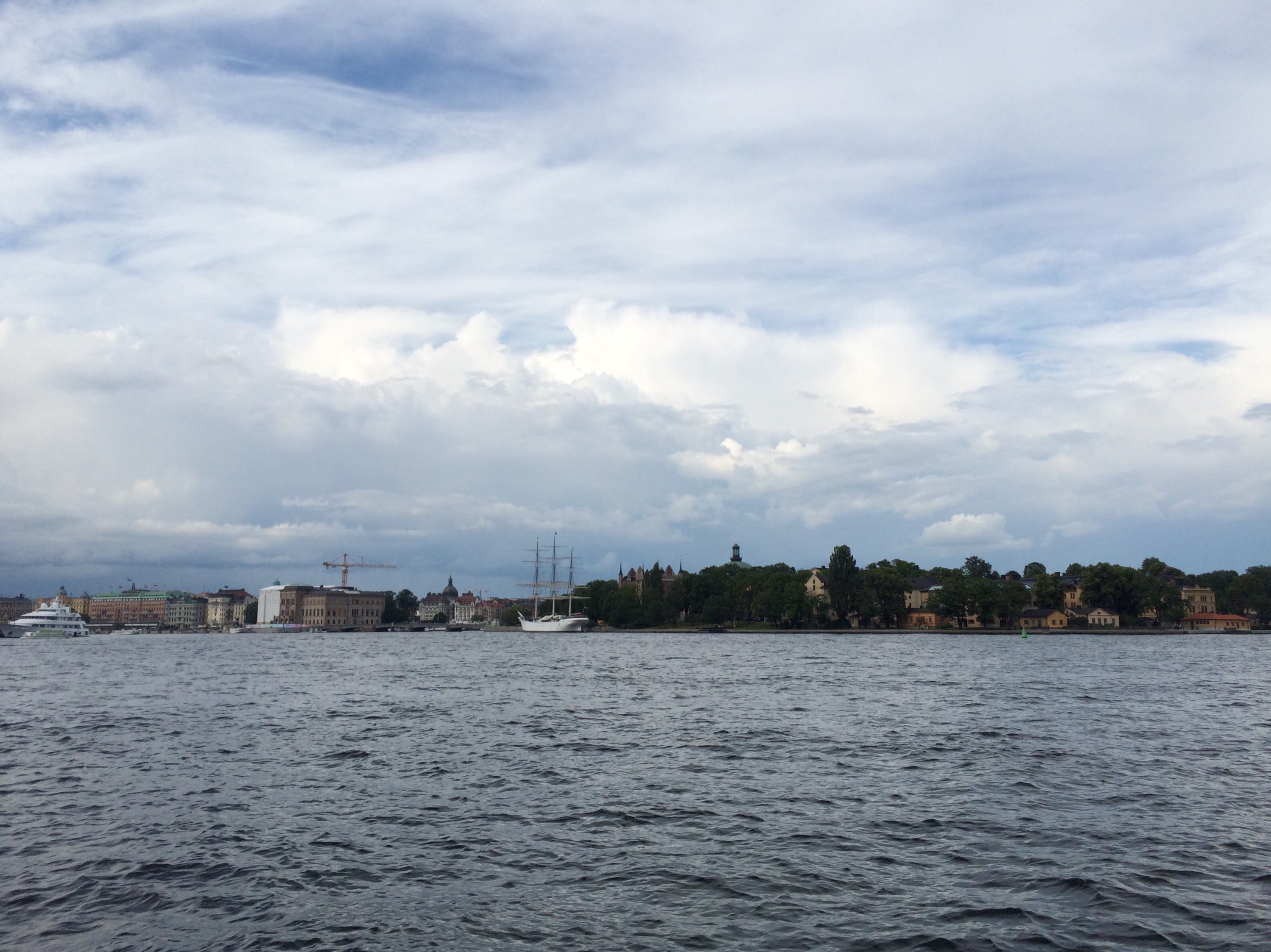 Djurgårdsfärjan från Slussen under massiva men inte heltäckande moln.