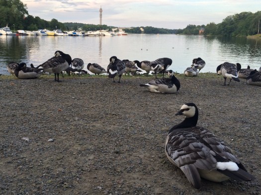 Kanadagässen har som vanligt invaderat gångvägen nära Djurgårdsbron.
