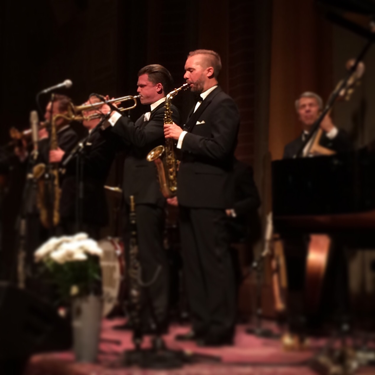 Det var fullt hus i läckra Grünewaldsalen i Konserthuset i söndags när Stockholm Swing All Stars spelade Ellington-låtar, och jag och Sofia hade fått platser på första bänk, nästan allra längst ut på ena kanten. Lite sned vinkel, visserligen, men jag gillar att vara nära. I publiken var 80 procent 60+ (och en bra bit uppåt), 15 procent 50+, 4 procent 20+ och så vi, som var de enda i rätt ålder, med andra ord ganska jämnåriga med grabbarna i bandet. (Det är så jag väljer att se på saken när publikmajoriteten kan få mig att känna att jag hamnat fel.)