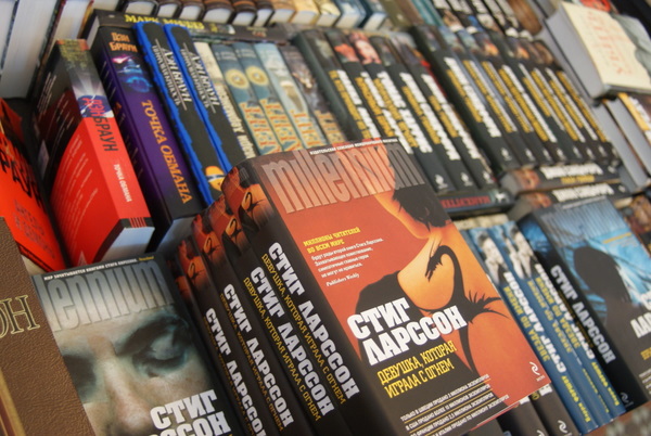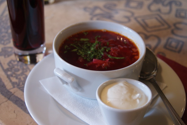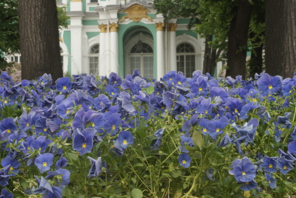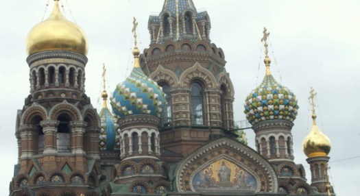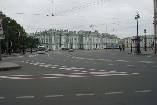 Sankt Petersburg-dagen: Efter viss kamp för korrekt information visste vi hur vi skulle ta oss till och från centrum, nämligen med en vit minibuss, obligatoriskt för oss visumlösa. Medan vi åkte längs enormt breda gator mellan gigantiska byggnader var det en engelsktalande guide som berättade för en handfull av passagerarna om stadens historia och de platser vi passerade, och vi försökte höra vad han sa trots att han bara med nöd och näppe överröstade radions ryska version av Living next door to Alice. Den här dagens höjdpunkter blev besöket på Coffehouse Company (en rysk variant av Espresso House som fanns i vartannat gathörn), en sväng på bokhandeln ”Böckernas hus”, beskådande av de superryska, färggranna lökkupolerna på Uppståndelsekyrkan och en märklig rundvandring i ett kvarter som intogs av husockupanter på 80-talet och nu blivit små jättekonstiga konst-, hantverks- och musikbutiker i förfallen, bohemisk miljö. När vi skyndade längs huvudgatan Nevskij Prospekt för att komma med sista bussen tillbaka bestämde vi oss för att köpa en kartong med bakverk från konditoriet Sever. Kön var som vanligt långsam och orättvis och vi stod och trampade nervöst hur länge som helst, men till slut var det vår tur och tjejen före oss kunde engelska och hjälpte till med beställningen. Så med kakaskrosetten i nypan halvsprang jag och Jenny bort till Vinterpalatset, där bussen faktiskt plockade upp oss på utsatt tid.