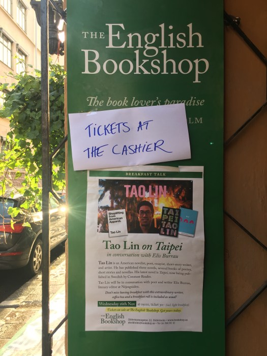 Ja, vad ska man säga att jag tog med mig från den här upplevelsen? Den stackars killen verkar ha drogat bort sin skärpa. Jag kan förstås inte med säkerhet säga att det förhåller sig så, men det handlade mycket om droger och om den fiktiva författaren han skrivit om i romanen Taipei som är ute på bokturné och går på olika droger under sina olika framträdanden. När man satt och lyssnade på den ganska fåordiga och ordentligt sävliga verkliga författaren var det omöjligt att inte dra vissa slutsatser. Intervjuaren gjorde ett bra jobb och fick till ett intressant samtal ändå – han fick stå för mycket av det själv – och Tao Lins förmåga som författare ska jag inte på något sätt nedvärdera, han verkar ha en hängiven fan club över världen.