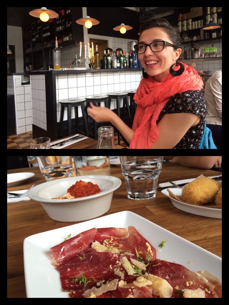 La Tonteria skymtar jag på hemvägen från jobbet, men även om dess existens inte var en nyhet hade jag inte undersökt den närmare förrän det var dags att bestämma födelsedagsrestaurang till efterskottsfirande av J. Vi gillar tapas, J som tidigare Barcelonabo och S och jag som uteätare i allmänhet, och har testat hyfsat mycket av vad Stockholm har att erbjuda i den vägen (inte minst under vår tid som mer systematiska tapastestare), så med visst jämförelsematerial beställde vi pimientos de Padrón, patatas con alioli och andra klassiker. Ett stort plus, om man frågar mig, var att det som skulle vara varmt kom in jättevarmt. Jättevarmt är besvärligt om man beställt en soppa till lunch, men bra när det gäller smårätter som ska delas under en långsam måltid. Det var smakrikt och plockvänligt och vi fick till en bra mix enbart från den vegetariska delen av menyn. Miljön fick också väl godkänt, det var nästan helt fullt, men stimmighet och ljudvolym hölls på en acceptabel nivå och att det var två (jag tror inte att det var fler) avdelade rum, istället för en enda större lokal, gav en gemytlig känsla.