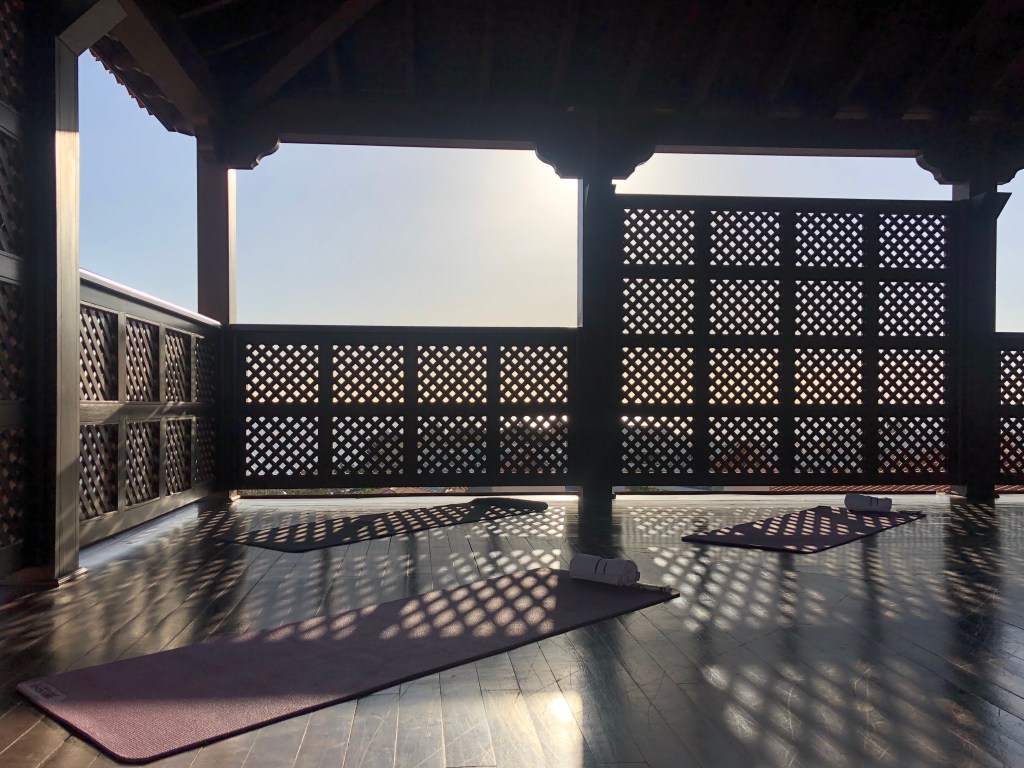 Mamma, svägerskan och jag var de enda deltagarna i instruktörens lista, så därför låg bara hans och våra mattor i tornrummet, med varsin liten handduk och müslibar. Sedan kom tre finska kvinnor vars bokning hade kommit bort. Det blev en lagom grupp ändå. Vi stretchade i en dryg halvtimme med utsikt över hav, berg och hotellanläggning.