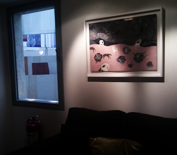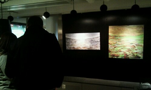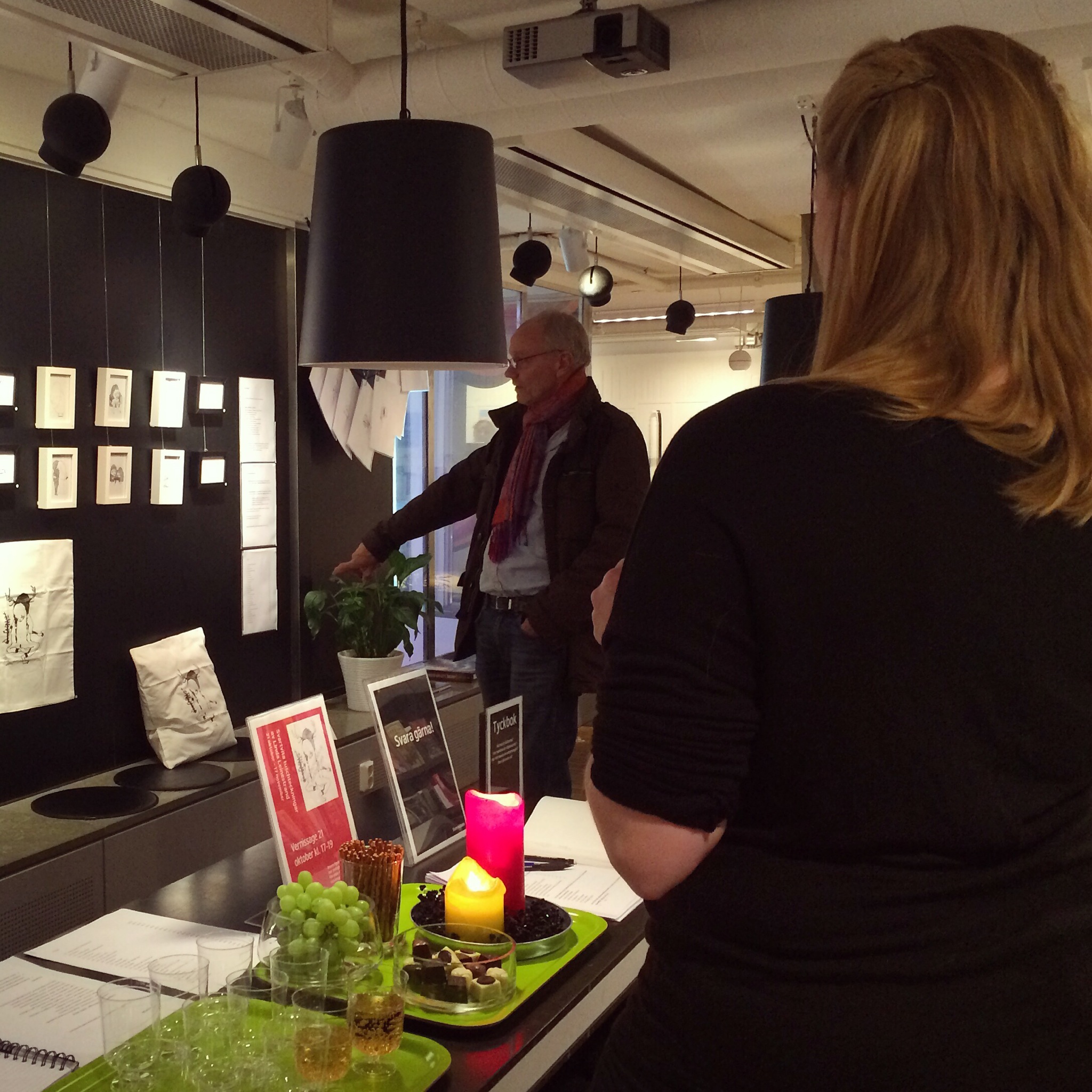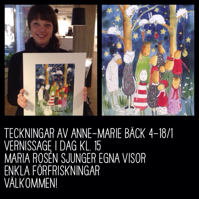 Tur att man har vernissagevana. Att arrangera på Sture bibliotek, alltså. Strax efter att vi öppnat kom den konstnär vars bilder skulle sättas upp i dag, vilket vi missat totalt. Den föregående utställningen satt fortfarande uppe, så det var bara att plocka ner den och kila in i arbetsrummet och ta fram salta pinnar, chokladtryffel och äppelcider ur gömmorna, och fixa kaffe och te, eftersom konstnären hade tagit med sig hembakta bullar. Någon affisch hade vi förstås inte gjort, så jag halade fram mobilen, tog ett par bilder, använde appen InstaQuote och la ut resultatet på Facebook.